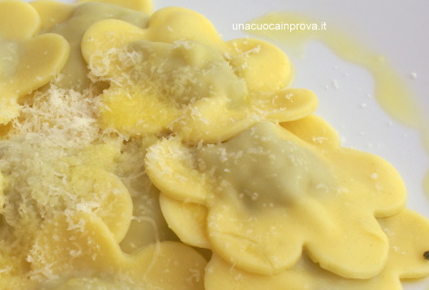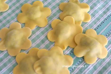 Versate la farina del vostro piano di lavoro ed amalgamatela con le uova, continuate ad impastare fino ad ottenere un impasto omogeneo e liscio. Stendetelo con il mattarello o molto più facile con la macchina per la pasta, ora con l’aiuto di due cucchiaini disponete su metà della sfoglia tanti ciuffetti di ripieno e copriteli con la metà della sfoglia rimasta, premete leggermente con le dita attorno al ripieno per far uscire l’eventuale aria rimasta all’interno, altrimenti durante la cottura potrebbero rompersi. Ora con lo stampino a margherita tagliate li ravioli. Cuocete in acqua bollente salata per circa 10/12 minuti, scolate e condite con un po’ di burro o un filo d’olio e tanto parmigiano.