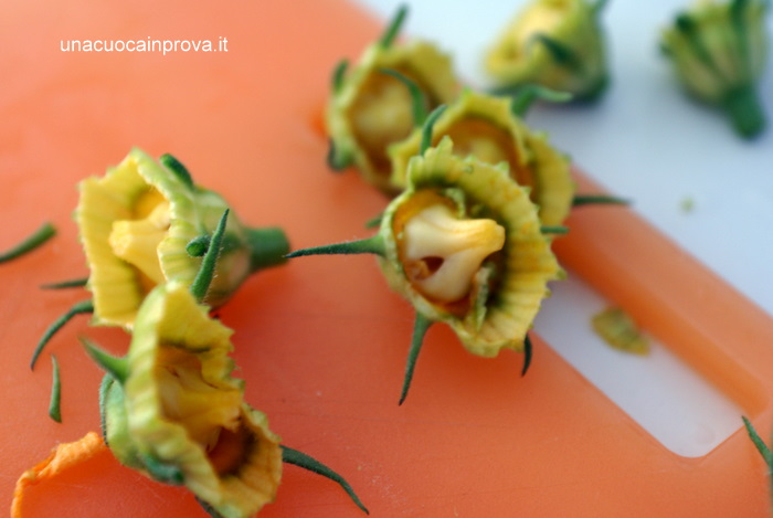 Ora la parte migliore: lavate i fiori di zucca …… devono essere belli freschi di un bel colore arancio acceso e verde chiaro…. togliete il pistillo e la parte centrale più dura di ogni fiore, apriteli e disponeteli a raggiera sopra la torta, girate verso l’interno il bordo della pasta sfoglia, in modo da formare un torciglione…… ammiratela un pochino perché sarà proprio bella. Ora copritela con un foglio di alluminio ed infornatela a 180° trascorsi 15 minuti togliete l’alluminio e lasciate cuocere ancora per 10 o 15 minuti.