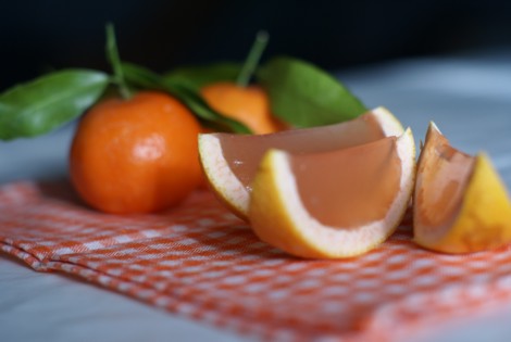 Ammollate la colla di pesce in acqua fredda, tagliate i pompelmi in due, incidete l’interno di ognuno, togliete la polpa spremetele e filtratela (dovreste ricavare 300 ml di succo eventualmente aggiungete dell’acqua).Togliete la pellicina bianca dalle mezze bucce e gettala. Mettete le bucce in frigorifero a raffreddare. Versate il succo in un pentolino aggiungendo lo zucchero e portate ad ebollizione, togliete dal fuoco aggiungete la colla di pesce ben strizzata. Passate la gelatina al colino, raccogliendola in una terrina e lasciate intiepidire. Riempite le mezze bucce e riponetele in frigorifero. Servitele tagliate a spicchi, ma se vi siete divertite ed avete ancora un po’ di tempo, vi consiglio di preparatene altri con pompelmi rosa…… quella trasparenza rosa corallo e quel profumino di agrumi sarà un successo assicurato!