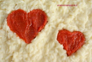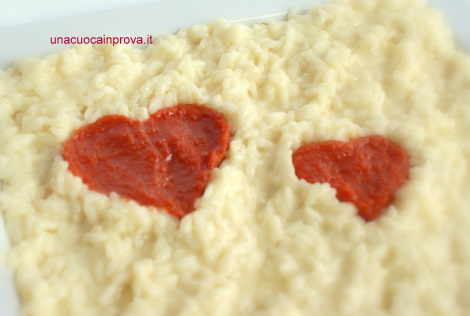 In un piatto con superficie piana posizionate due piccoli stampi a forma di cuore e versate al loro interno la salsa di pomodoro che avrete miscelato con del peperoncino in polvere, ora versate tutto intorno il risotto, livellate un pochino “et voilà”, pronto da portare in tavola.