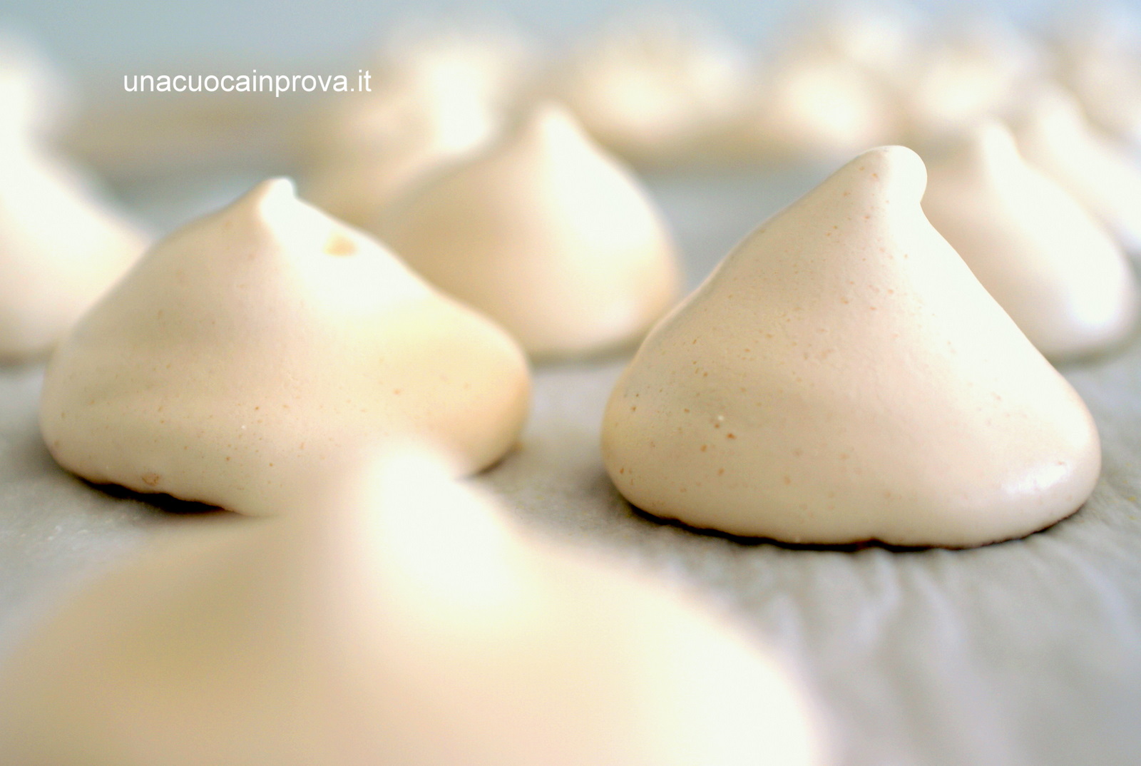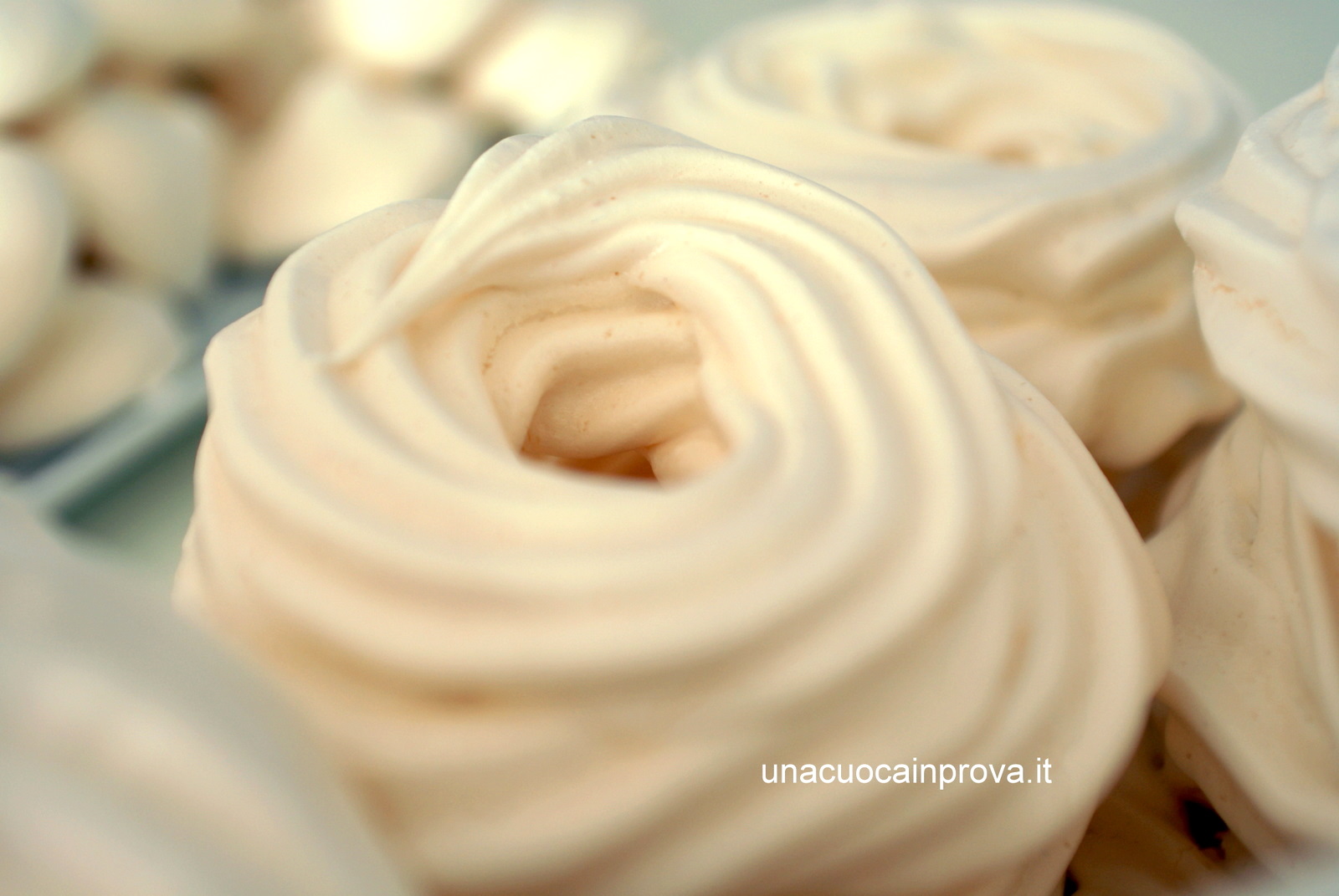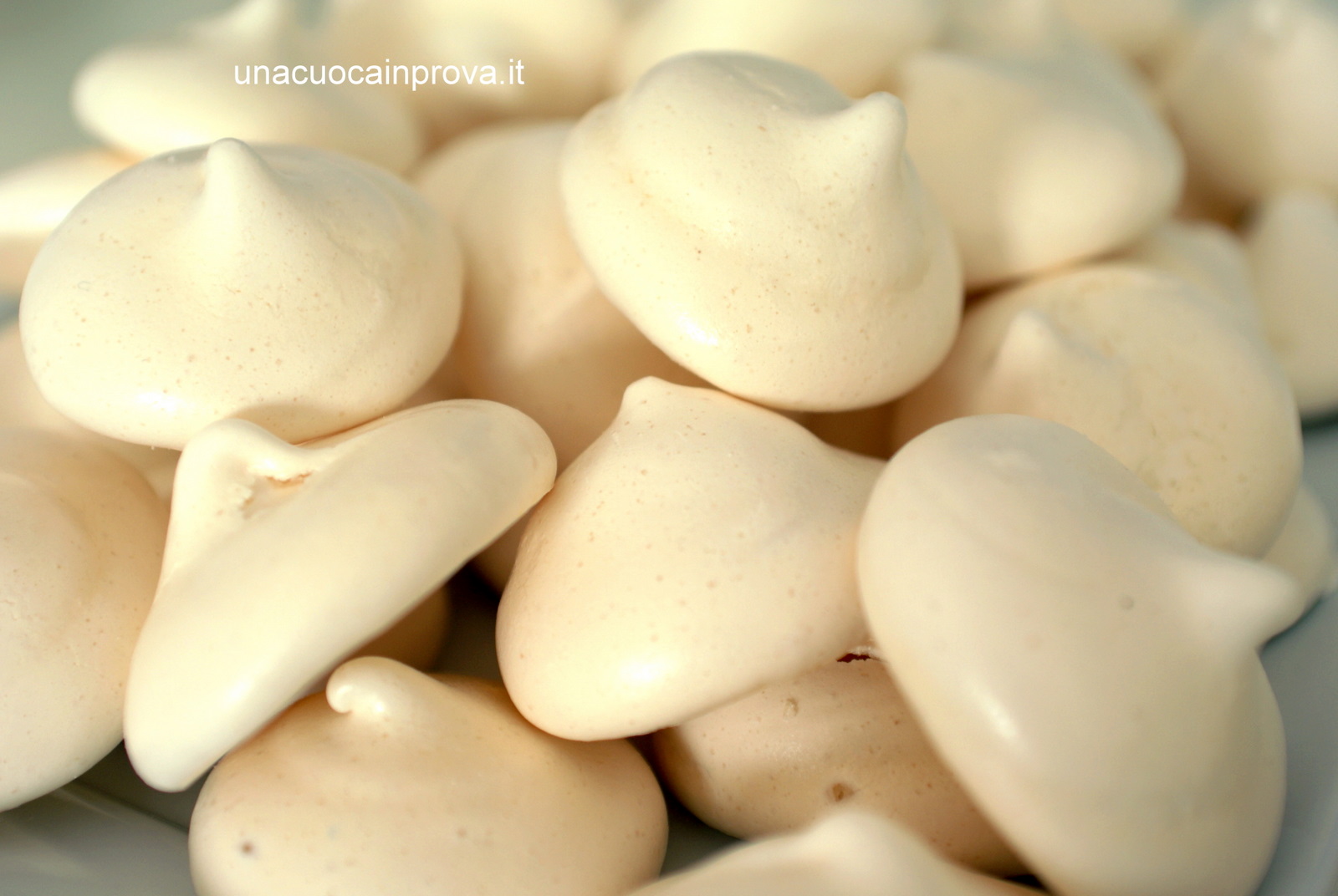 Se vi capita di preparare un dolce o dei biscotti, che prevedano il solo utilizzo di tuorli, mi raccomando non buttate gli albumi, ma utilizzateli per questa ricetta, otterrete delle bellissime meringhe, da sgranocchiare subito o da conservare per la prima buona occasione……………. a proposito, una buona occasione ci sarebbe, oggi il mio blog festeggia il suo primo compleanno, quindi me ne mangio un’altra, ringraziando tutti voi che in questo anno mi avete seguita ed incoraggiata.