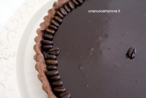 Ho cercato inutilmente in lungo ed in largo i micro-cioccolatini a forma di chicco di caffè, ma si sa l’estate non è proprio il periodo appropriato per cercare cioccolato o cioccolatini, quindi ho decorato la crostata con veri chicchi di caffè, veramente belli da vedere e poi anche buoni da mangiare, in bocca si sbriciolano e sprigionano un aroma ed un sapore leggermente amaro che con il cioccolato fondente sono una vera delizia.