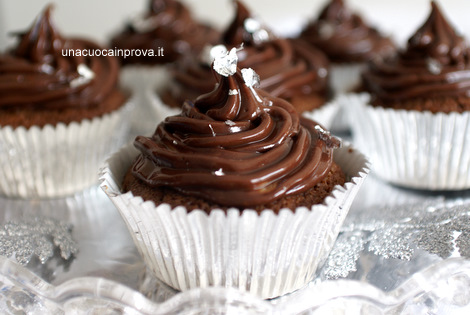 Sciogliete a bagnomaria il cioccolato fondente e una volta sciolto lasciatelo raffreddare 10 minuti circa, amalgamatelo con il latte ed il burro, otterrete una crema molto morbida, versatela in una tasca da pasticceria dove avrete inserito una punta rigata, mettete in frigorifero 10 minuti, farcite i cupcakes e decorateli con zuccherini o briciole di foglia argento.