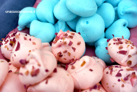 Versate il tutto in due sac a poche e date forma alle vostre meringhe, ma prima di metterle in forno spolverizzate quelle rosa con i petali di rosa, infornate a 100° (forno ventilato oppure forno statico ma tenendo la porta del forno semi aperta) per circa un’oretta.