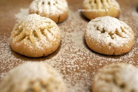 Ora formate nove palline e con i rebbi di una piccola forchetta appiattitele leggermente. Infornate a 150° per circa 15 minuti, lasciate raffreddare completamente e spolverizzate con lo zucchero a velo.