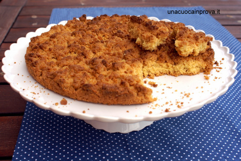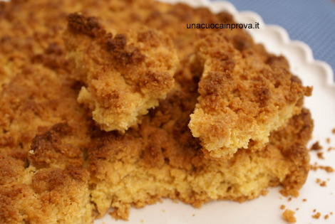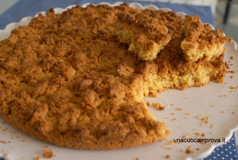 Imburrate uno stampo del diametro di 28 cm, ora spezzettate l’impasto in tante grosse briciole e fatele cadere nello stampo fino a ricoprirlo, ma non schiacciate, la superficie dovrà essere tutta granulosa.