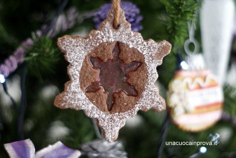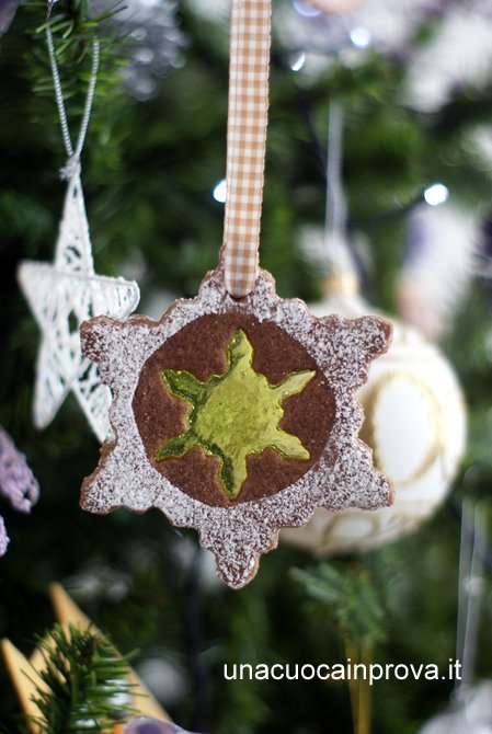 Con questi fiocchi di neve voglio augurare un Felice Natale a tutti voi che mi seguite sempre molto affettuosamente, se siete presi da mille preparativi, ritagliatevi un piccolo spazio di tempo e preparate questi biscotti, vi rilasserà, sono di semplice pasta frolla al cioccolato e non di pasta speziata dei gingerbread, inoltre le caramelle sciolte al loro interno diventano un velo molto sottile che si spezzerà delicatamente assieme al biscotto.
