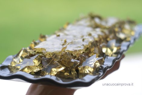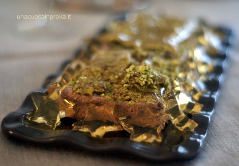 Se userete uno stampo piccolo da plum cake e vorrete avere uno strato di gelatina sopra allora prima di tutto scaldate 250 gr di acqua e contemporaneamente ammollate la gelatina in acqua fredda per circa 10 minuti, strizzatela e scioglietela nell’acqua calda, versatela nello stampo e fate solidificare, poi copritela con i 30 gr pistacchi che avrete tritato grossolanamente, tenete da parte fino a quando sarà pronto il paté.