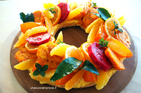 Oggi avevo voglia di preparare una crostata a forma di ciambella con tanta frutta fresca, così ho tolto dallo scaffale alto della cucina lo stampo apribile per ciambella che uso troppo poco ed ho preparato la base, l’ho farcita con un bel po’ di crema pasticcera e nella scelta della frutta ho preferito utilizzare solamente frutta di questo periodo e quasi tutta di color arancio, dai fichi d’india ai cachi, dalle clementine alle arance, alcune foglioline di menta che ancora resistono nel terrazzo, qualche foglia staccata dalle clementine e la crostata era pronta.