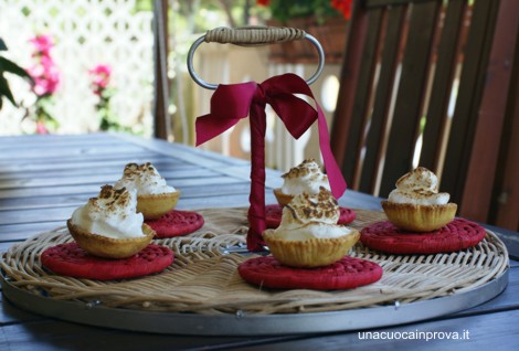 - Mettete gli albumi ed il restante 1/4 di tazza di zucchero in una terrina termica e cuocete a bagnomaria fino a quando lo zucchero non si sarà sciolto ed gli albumi non saranno leggermente caldi. Con il mixer a potenza media frullate fino a quando il composto diventerà schiumoso, aggiungete il cremor tartaro, aumentate la velocità e continuate a frullare fino ad essere denso e brillante (fate la prova se prelevandone una cucchiaiata rimane come una cresta è perfetta). Con una piccola spatola dividere la meringa tra le 12 “mini pies” formando delle crestine.