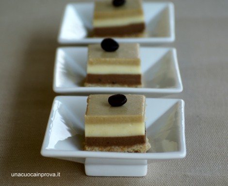 Ora prendete il vostro stampo preferito o un semplice stampo da plumcake versate la crema al cioccolato coprite e mettete in frigorifero per un’ora, poi estraete e versate la crema alla vaniglia, ricoprite e rimettete in frigo per un’altra ora. Completate con la crema al caffè e lasciate in frigorifero per almeno due ore.