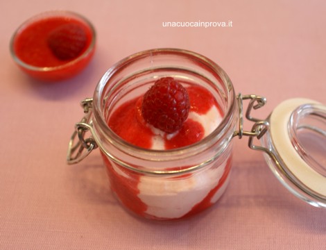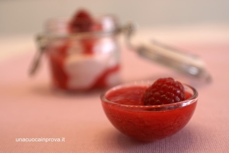 Prima di servirle frullate i lamponi con poco zucchero a velo e qualche goccia di distillato ai lamponi, versatene un cucchiaio sopra ad ogni porzione e decorate con un lampone intero…… oppure servite a parte come ho fatto io! Che bontà!